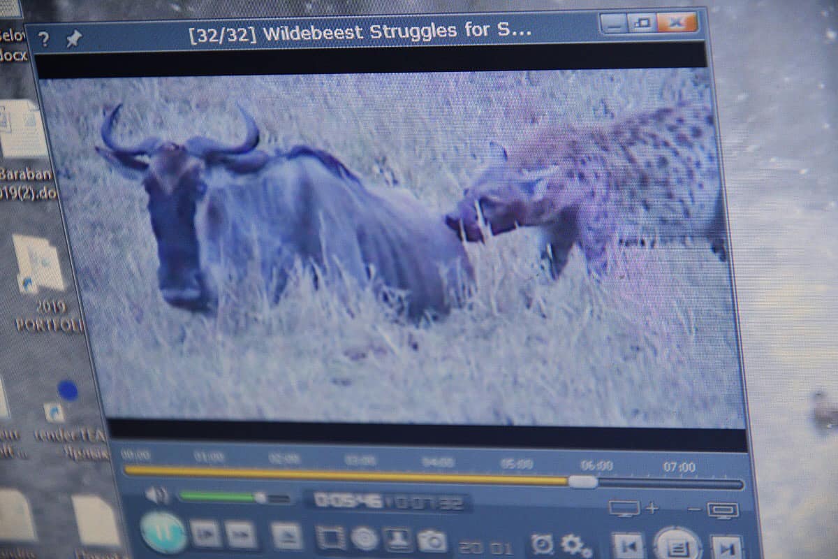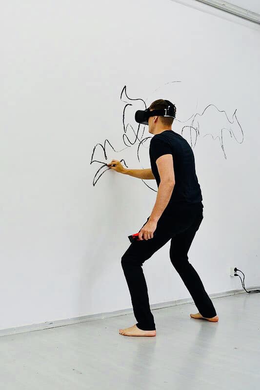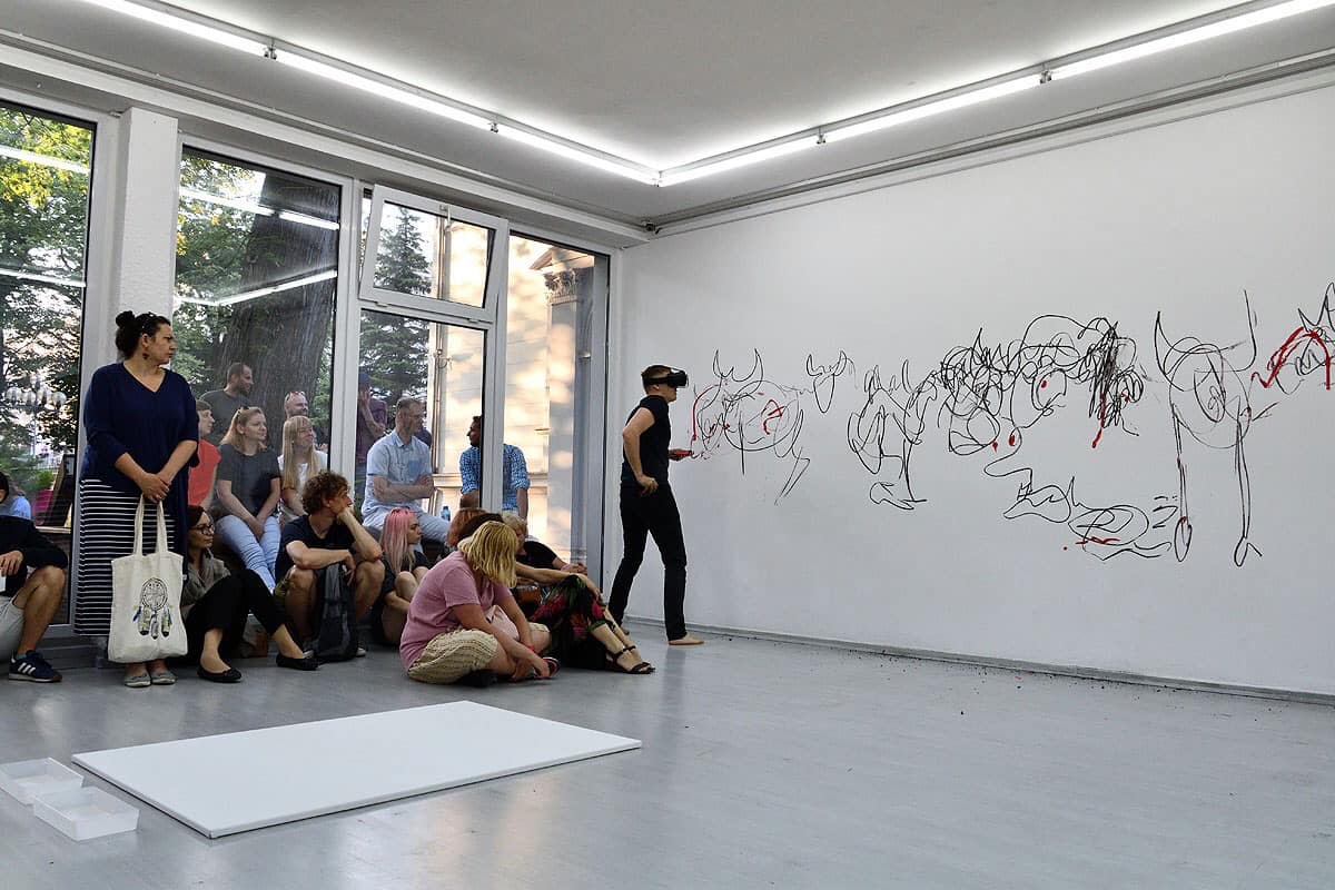 “Animal hunting” 2019. Festival of Kharkov performance “Baraban” BWA Gallery in Zielona Góra, Poland. Creating a picture on the wall by the video from YouTube "Animal Hunting" in VR glasses. Rock paintings depicting prey and predator, primitive history in modern realities. Vlas Belov. Wirtualny plener - Hunting animals. Photo by Karolina Spiak