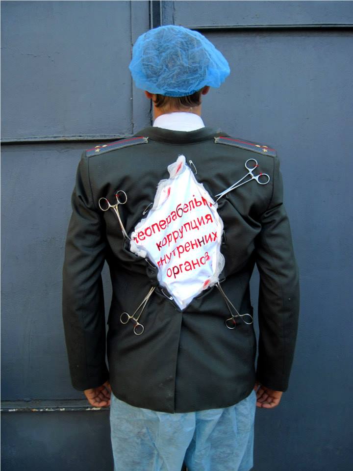 2014. Performance-intervention “Illustration of lustration” or “Inoperable corruption of internal organs”, at the exhibition at the Institute of Problems of Modern Art, Kiev.