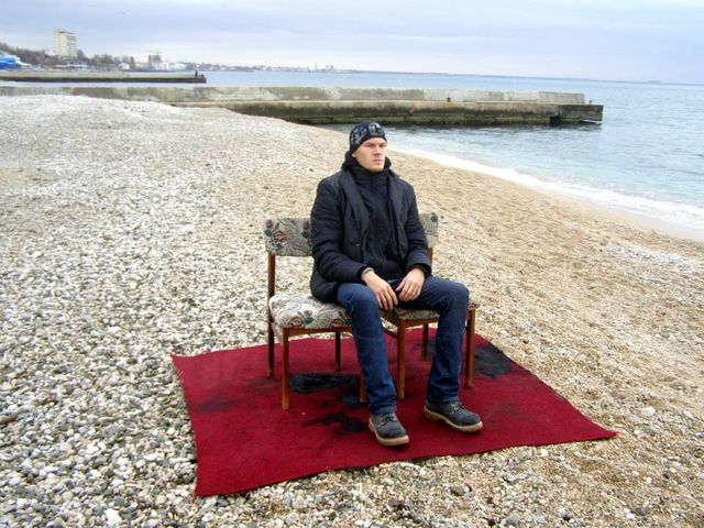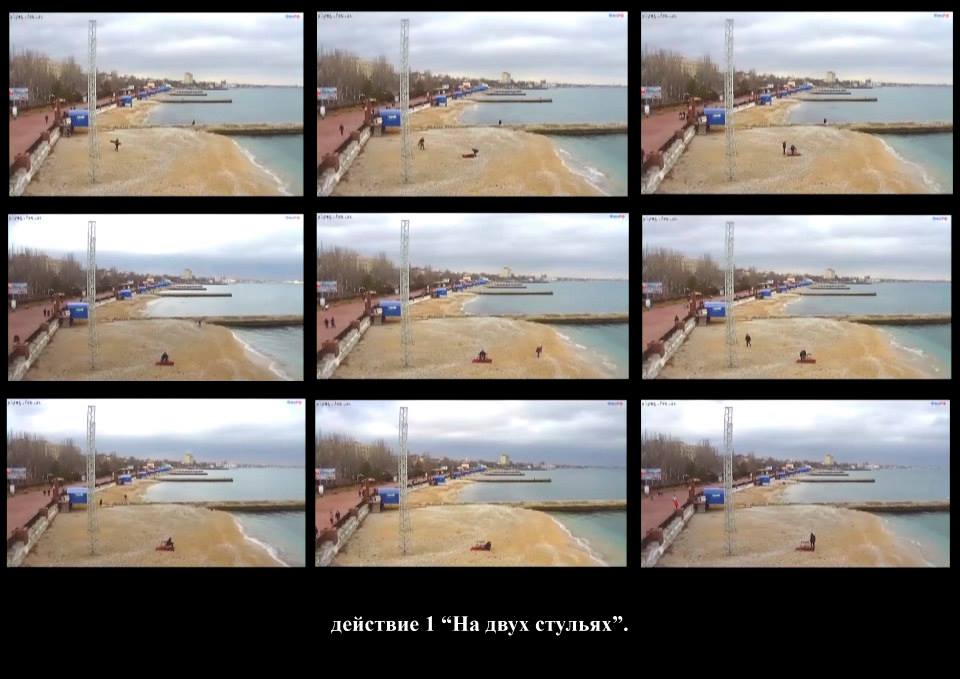 2014. Fixing the implementation of the online performance “On Two Chairs” in three actions. The beach Pebbles of Feodosia, Crimea, 11.12.2014